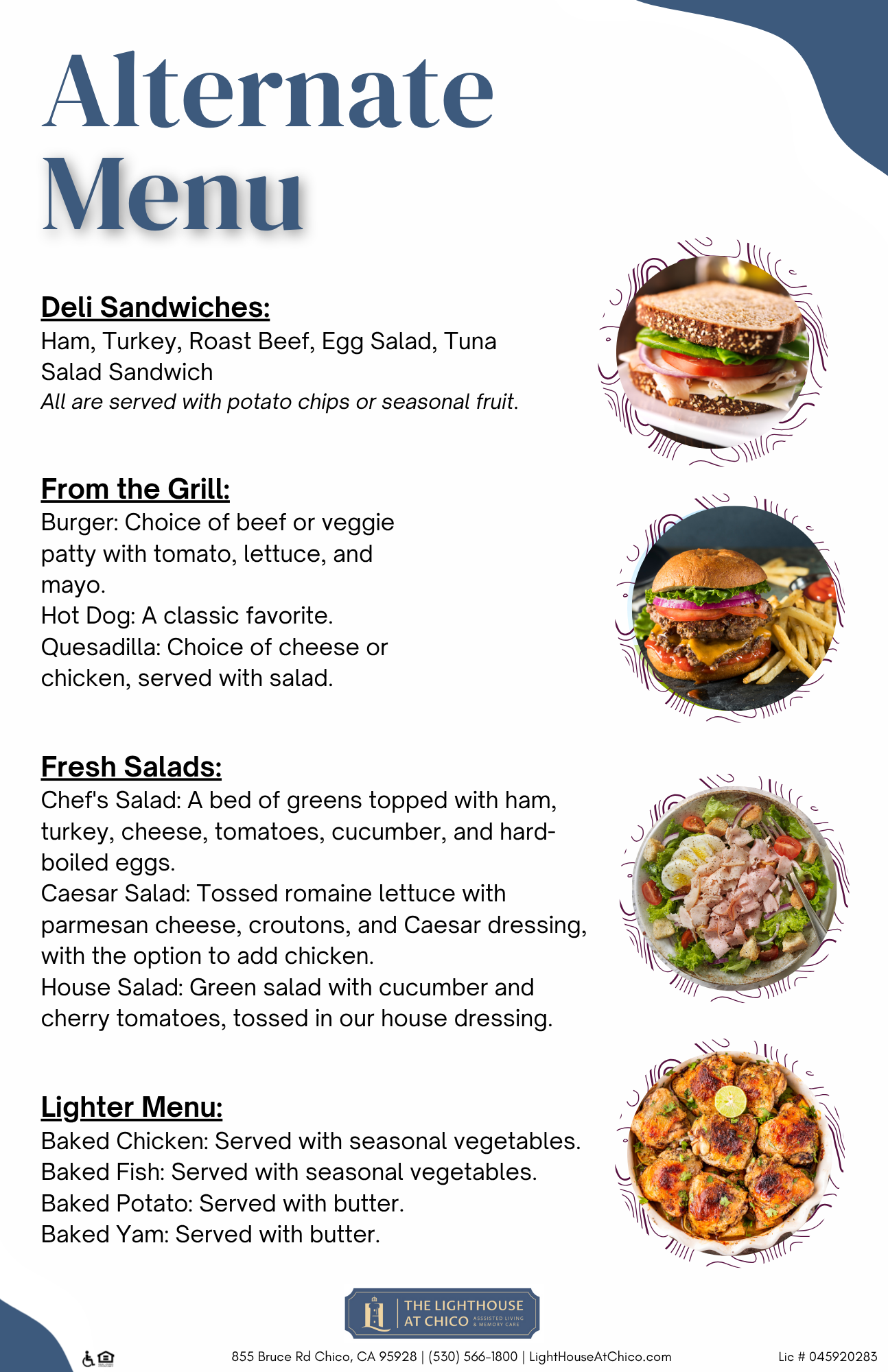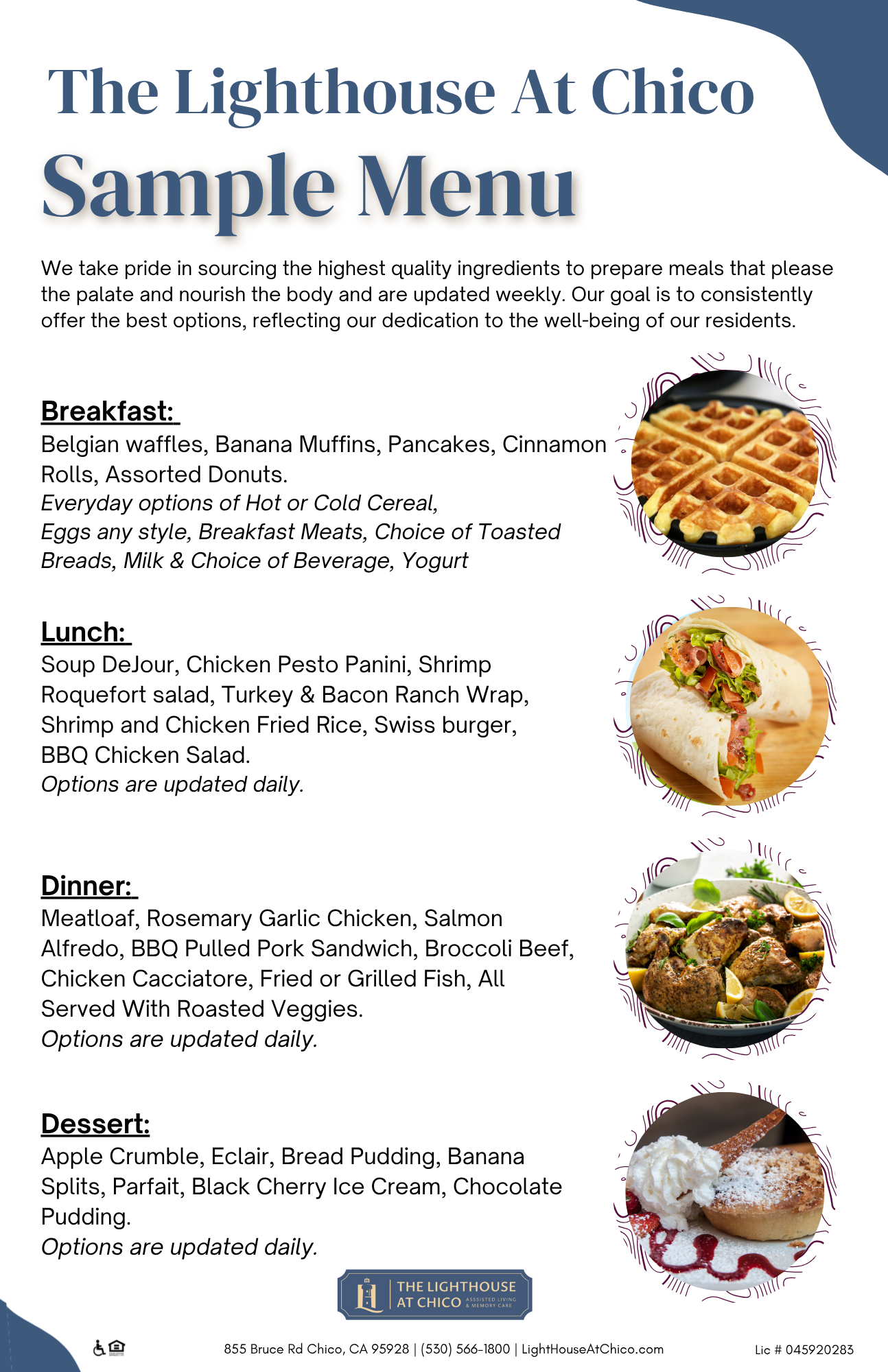 At The Lighthouse at Chico, we believe that nourishment is more than just food on a plate; it’s an essential part of our residents’ health and happiness. Our talented chef and culinary team are at the heart of this belief. With a passion for gastronomy and a knack for creating mouth-watering dishes, our chef leads the kitchen with expertise and creativity.